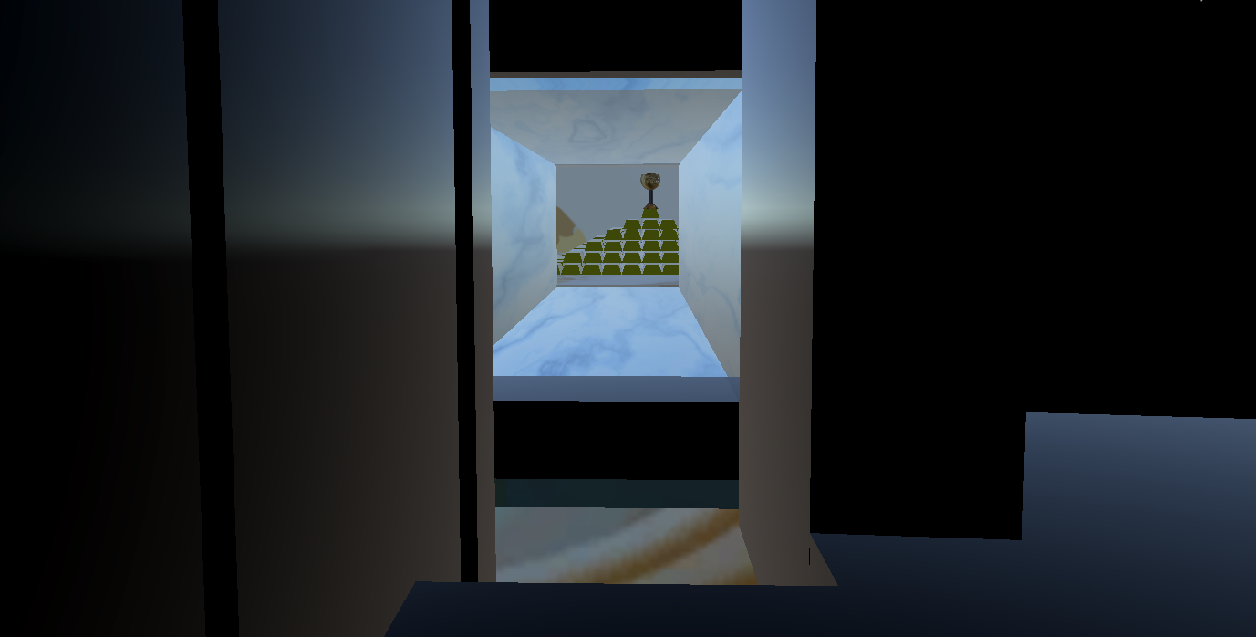 This world is very cool, the meshes in the screenshots of the game really add a lot of polish to the game and make it feel like a completely different world. I enjoy the stairway area the most when playing the game because it feels like you have to be careful when going up the stairs or else you'll fall off! The trophy room was an awesome touch to the ending of the game.